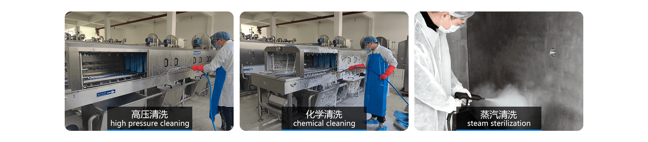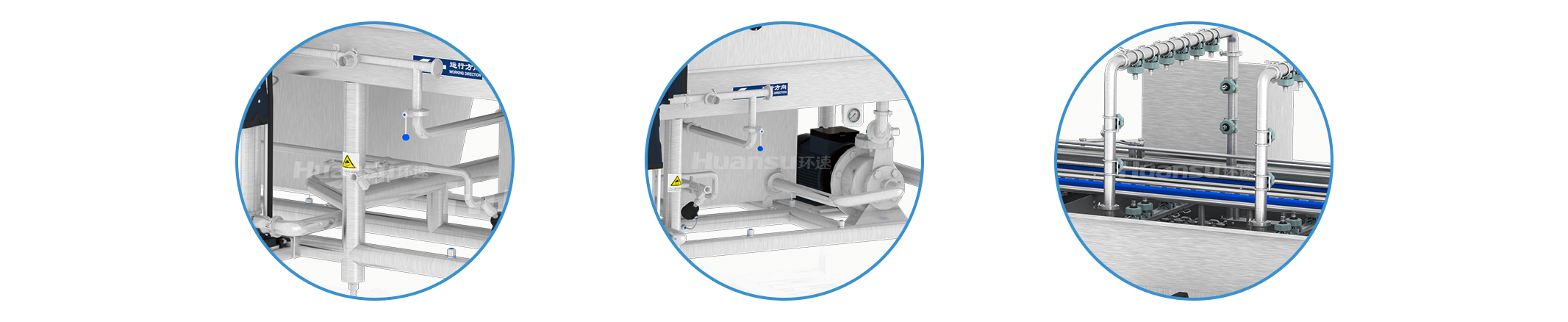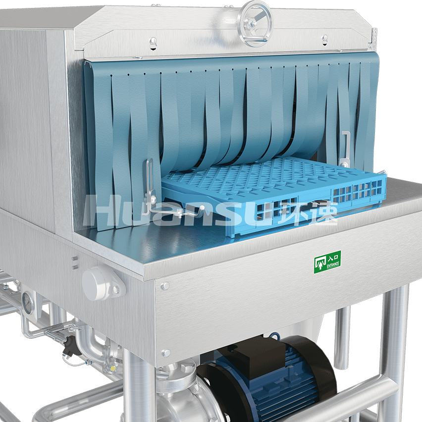 設(shè)備整機(jī)防水防潮,可直接進(jìn)行人工擦拭清洗、化學(xué)清洗,省時(shí)省力;采用無(wú)縫焊接、圓管底架、管內(nèi)走線等設(shè)計(jì),設(shè)備外表面光滑易清洗,污漬不易殘留。隧道側(cè)擋板、管路、噴頭等部件采用易拆設(shè)計(jì),確保清洗無(wú)障礙;隧道進(jìn)出口設(shè)有擋水簾,有效防止水花飛濺和蒸汽泄露,有利于保持車間衛(wèi)生。