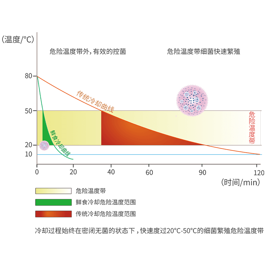 縱觀食品從原料到成品的整個(gè)流程,冷卻階段是食品遭受微生物污染的重災(zāi)期,而真空冷卻在防控微生物方面的優(yōu)異性能,可在源頭上改善食品安全。其一,冷卻發(fā)生在全封閉的真空中,無(wú)視外部污染威脅,可以保持食品的純粹;其二,冷卻速度極快,可顯著縮短食品在適宜微生物增殖的溫度段內(nèi)的停留時(shí)間,相較于傳統(tǒng)方式大幅降低微生物的含量,使食品獲得更長(zhǎng)的賞味期。