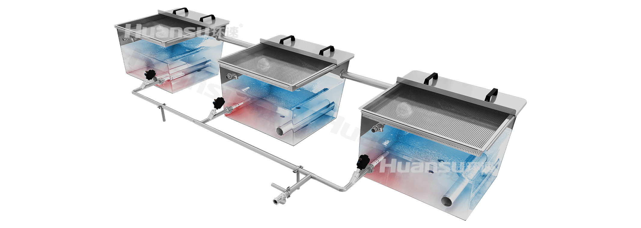 供水系統(tǒng)由三個(gè)水箱和自來(lái)水管路組成,分別為不同的清洗段供水,專水專用,合理分配水資源的潔凈度。水箱設(shè)有兩道過(guò)濾網(wǎng),各清洗階段使用過(guò)的水不會(huì)直接排放,而是回收到對(duì)應(yīng)水箱,經(jīng)兩重過(guò)濾后循環(huán)利用。三個(gè)水箱由兩根管路串聯(lián),管路采用梯度設(shè)計(jì),可確保水流由高到低單向運(yùn)動(dòng),依次為各級(jí)水箱補(bǔ)水,并起到持續(xù)稀釋、凈化水質(zhì)的作用。