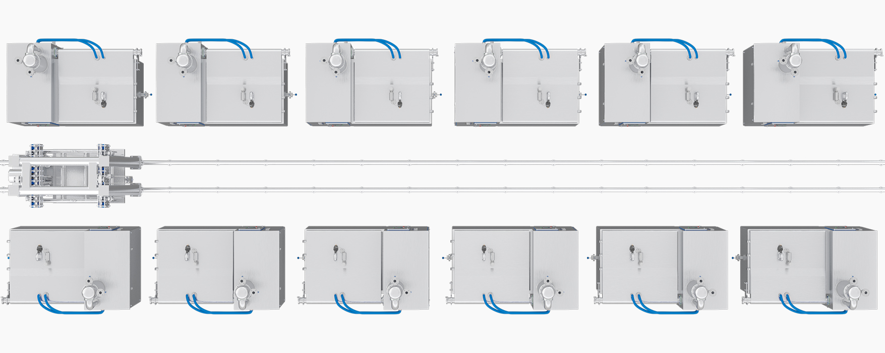 根據(jù)食品種類和車間實況選擇性配置冷卻機的款式與排布方案,(單艙室款多設(shè)備橫列式排布/多艙室款上下層疊式排布/頂開門款陣列式排布),輔以配套的自動輸送帶與智能移送機運載食品,交由智控中樞統(tǒng)一調(diào)度,全流程自主運行無需人工;發(fā)揮真空冷卻速度快、內(nèi)外同冷、密閉無菌的優(yōu)勢,并根據(jù)食品種類調(diào)試專屬冷卻工藝,實現(xiàn)智能化、大批量、連續(xù)式的食品冷卻。