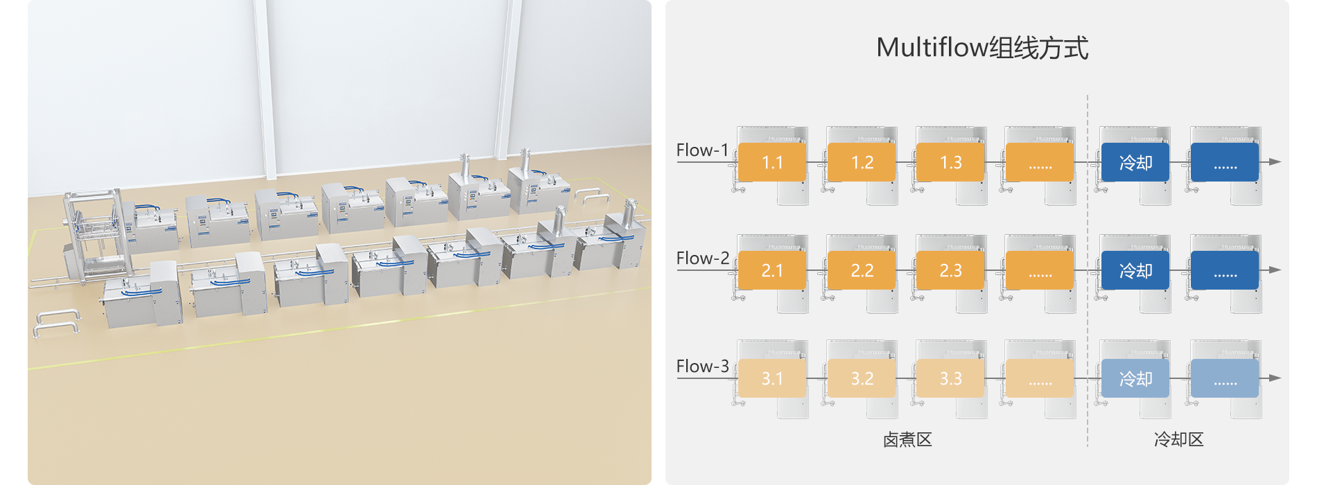 Multiflow組線,與頂開門真空冷卻機(jī)組合使用,煮后即冷。