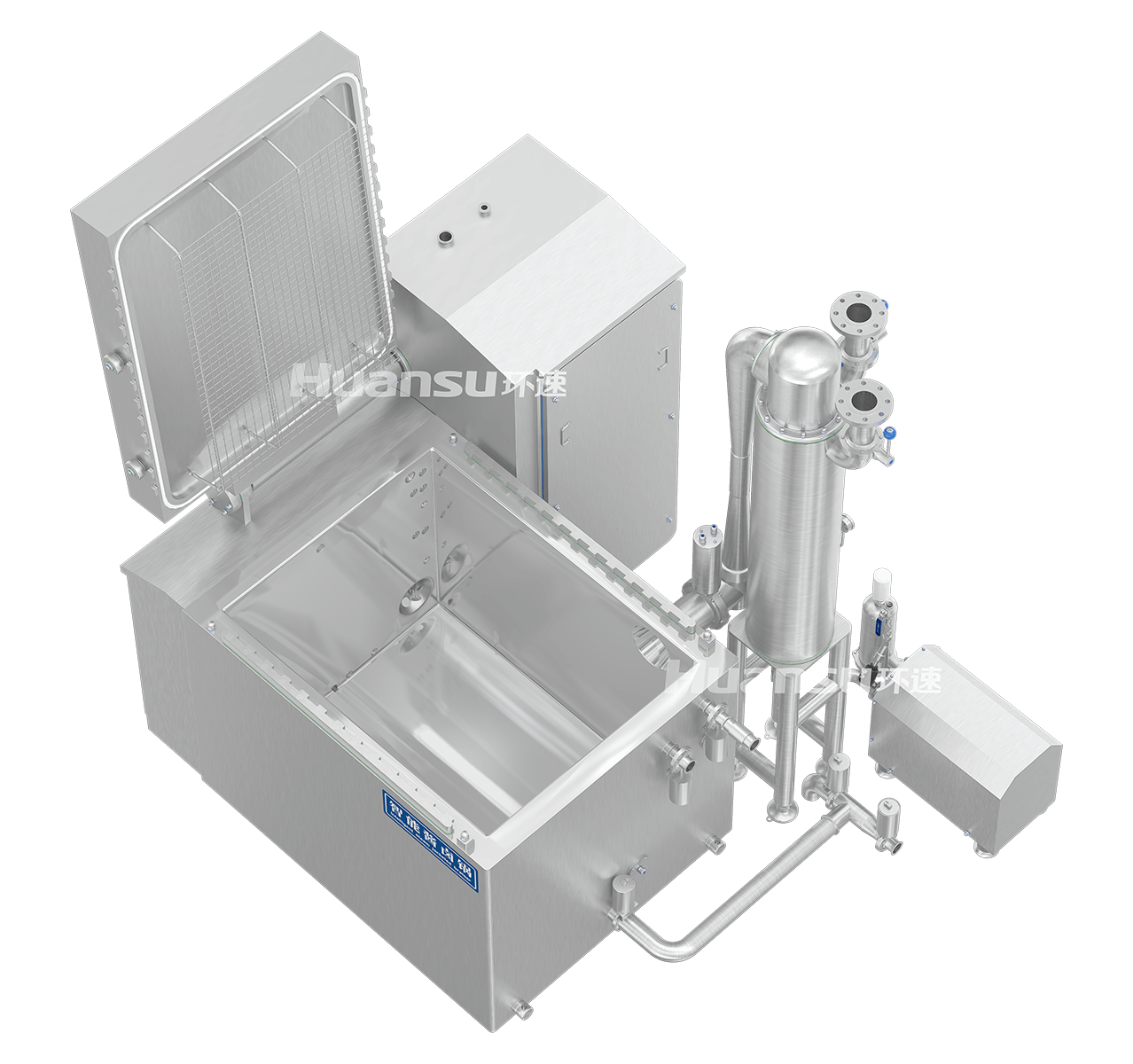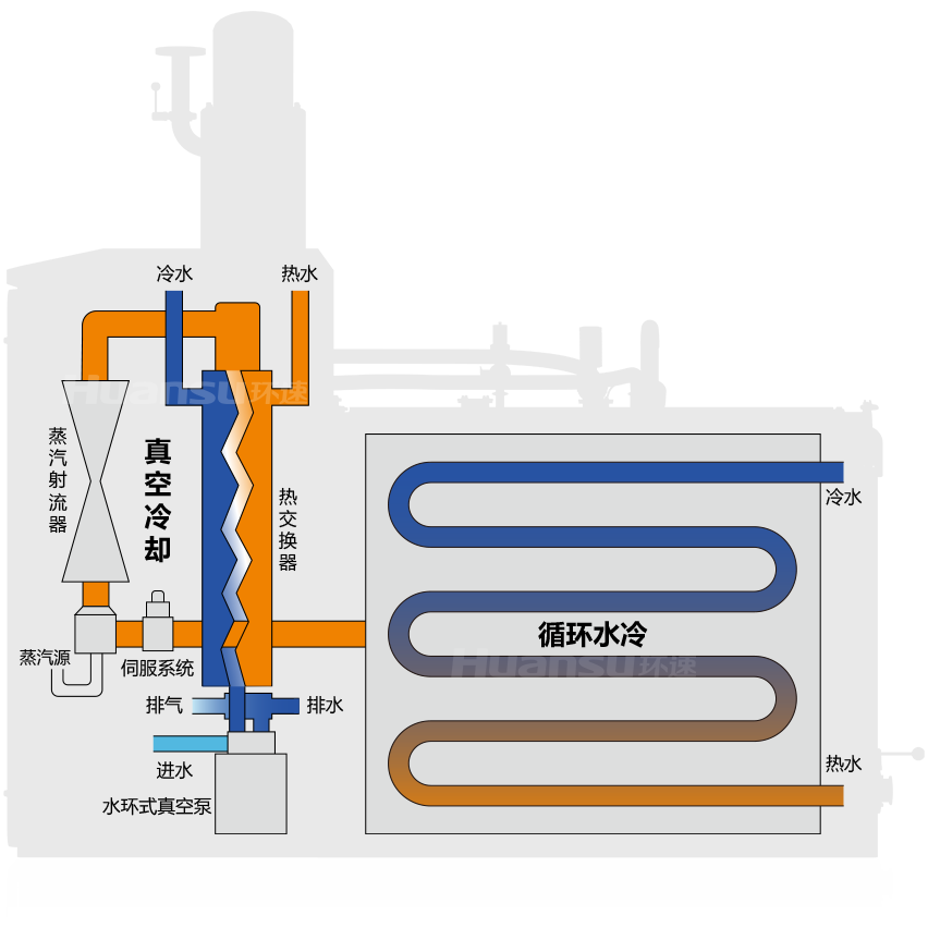 采用循環(huán)水冷、真空冷卻相結(jié)合的方式對高溫食材降溫。通過調(diào)節(jié)三通閥,把與夾層相通的蒸汽管路切換為循環(huán)水管路,即可對內(nèi)膽實(shí)施水冷降溫;設(shè)備配備真空冷卻系統(tǒng),利用水環(huán)泵、蒸汽射流器、換熱器聯(lián)合抽真空,使水以較低的沸點(diǎn)沸騰進(jìn)而吸收熱量,實(shí)現(xiàn)快速控菌冷卻。