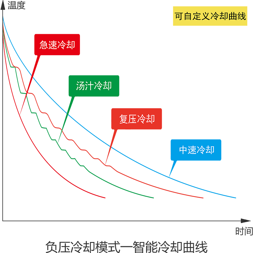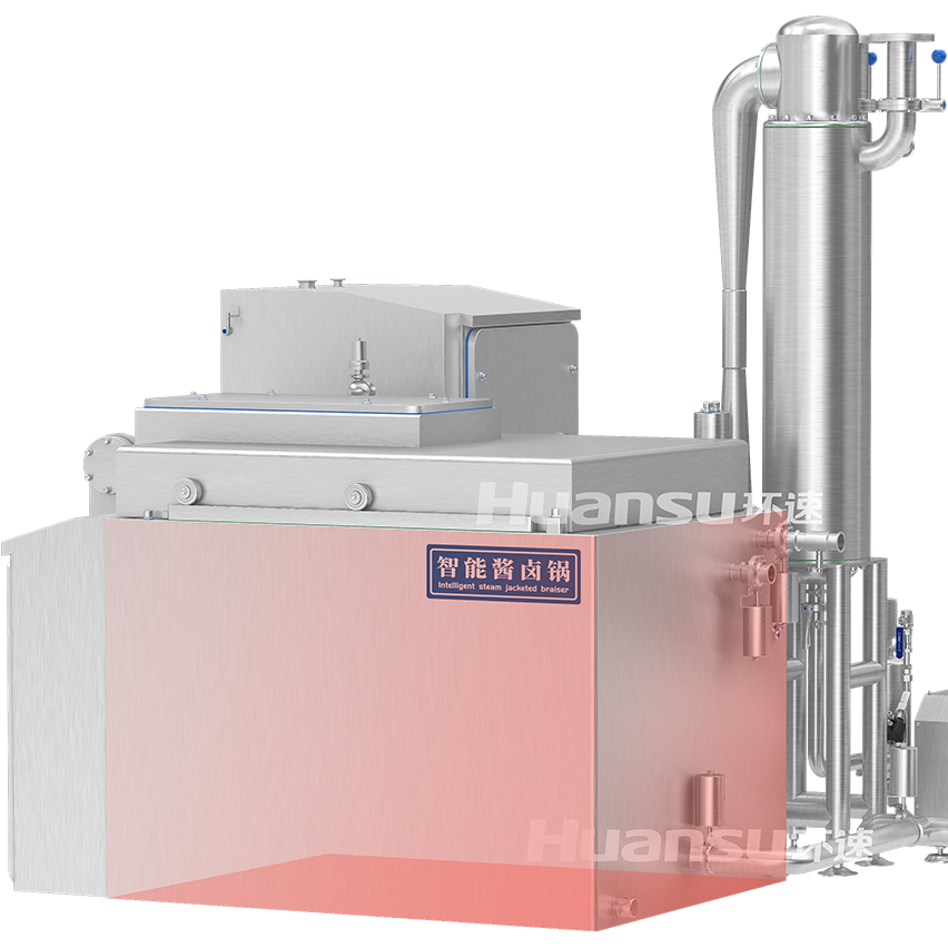 利用蒸汽對夾層內(nèi)膽進(jìn)行立體式加熱,溫控系統(tǒng)實(shí)時(shí)控制蒸汽通量,支持正壓/常壓/負(fù)壓三種鹵煮工藝;鹵煮完成后啟動循環(huán)水冷與真空冷卻功能,使食品快速降溫。