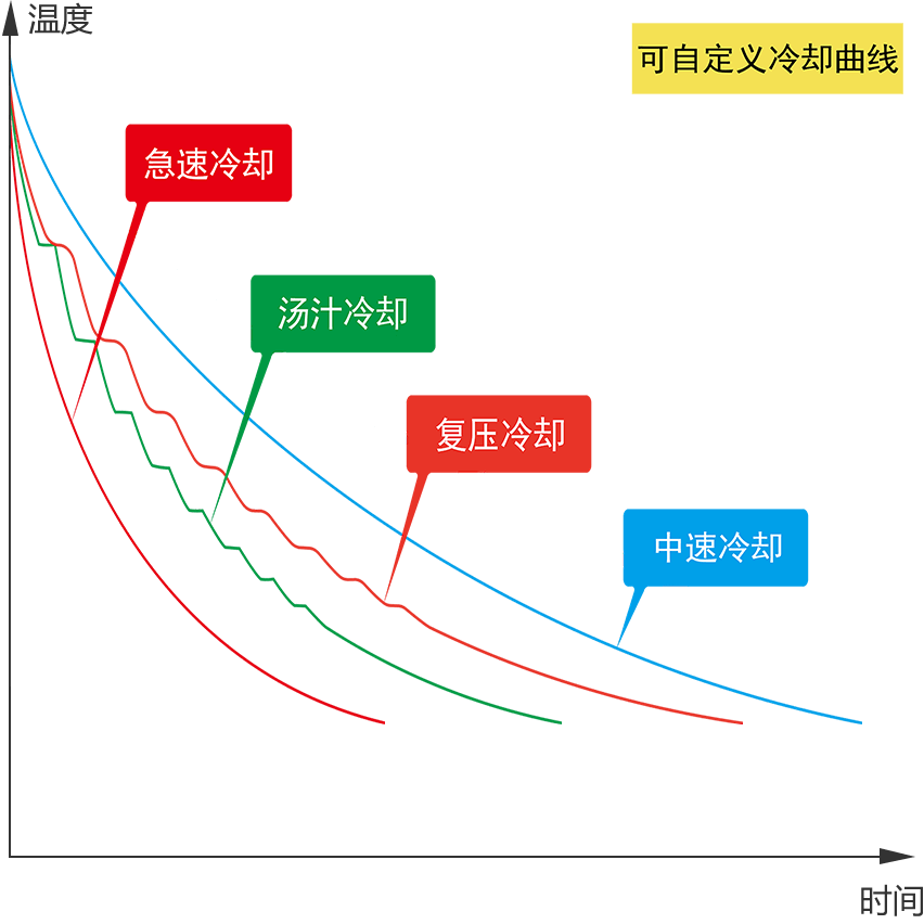 基于氣壓-沸點(diǎn)-食品溫度的對(duì)應(yīng)關(guān)系,智能系統(tǒng)通過伺服閥門精確調(diào)控抽空氣的周期與節(jié)奏,使真空艙內(nèi)的氣壓按照預(yù)期進(jìn)行變化,從而控制冷卻的速度、液體的沸騰高度,實(shí)現(xiàn)變速冷卻和防飛濺功能;允許用戶根據(jù)食品的種類及特性定制專用的參數(shù)曲線,提升冷卻的效率與質(zhì)量。